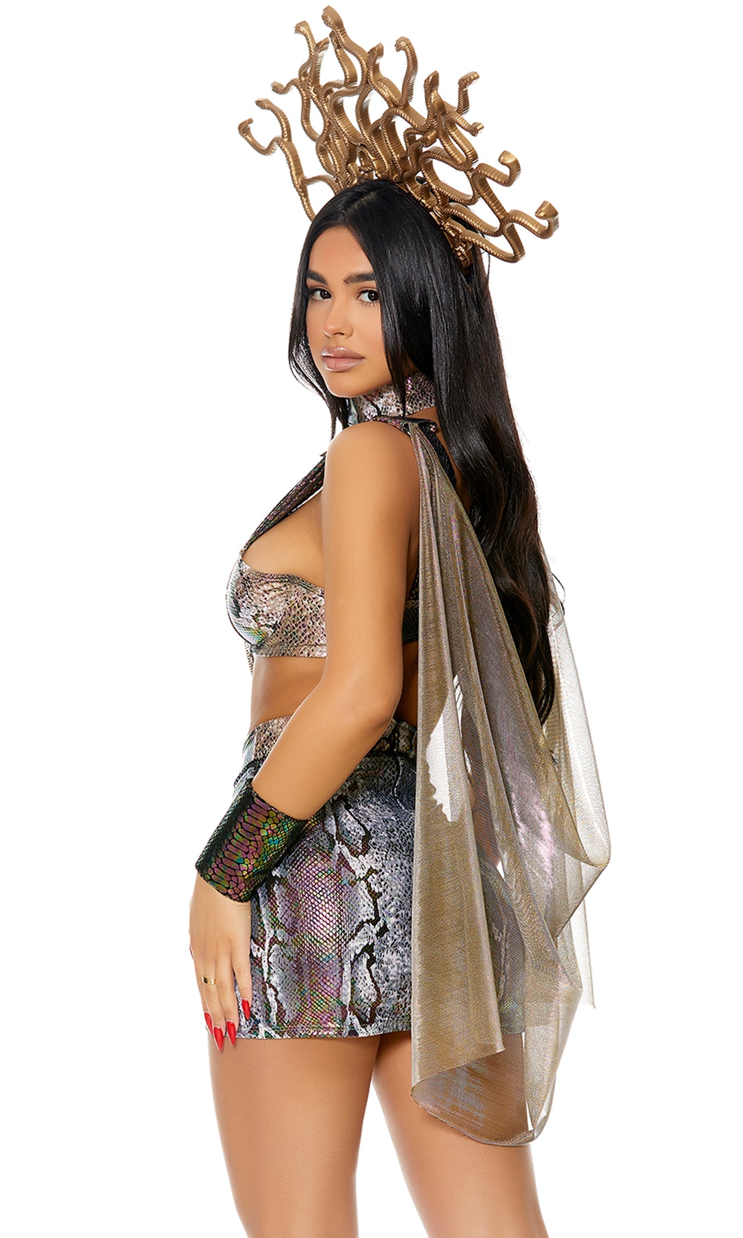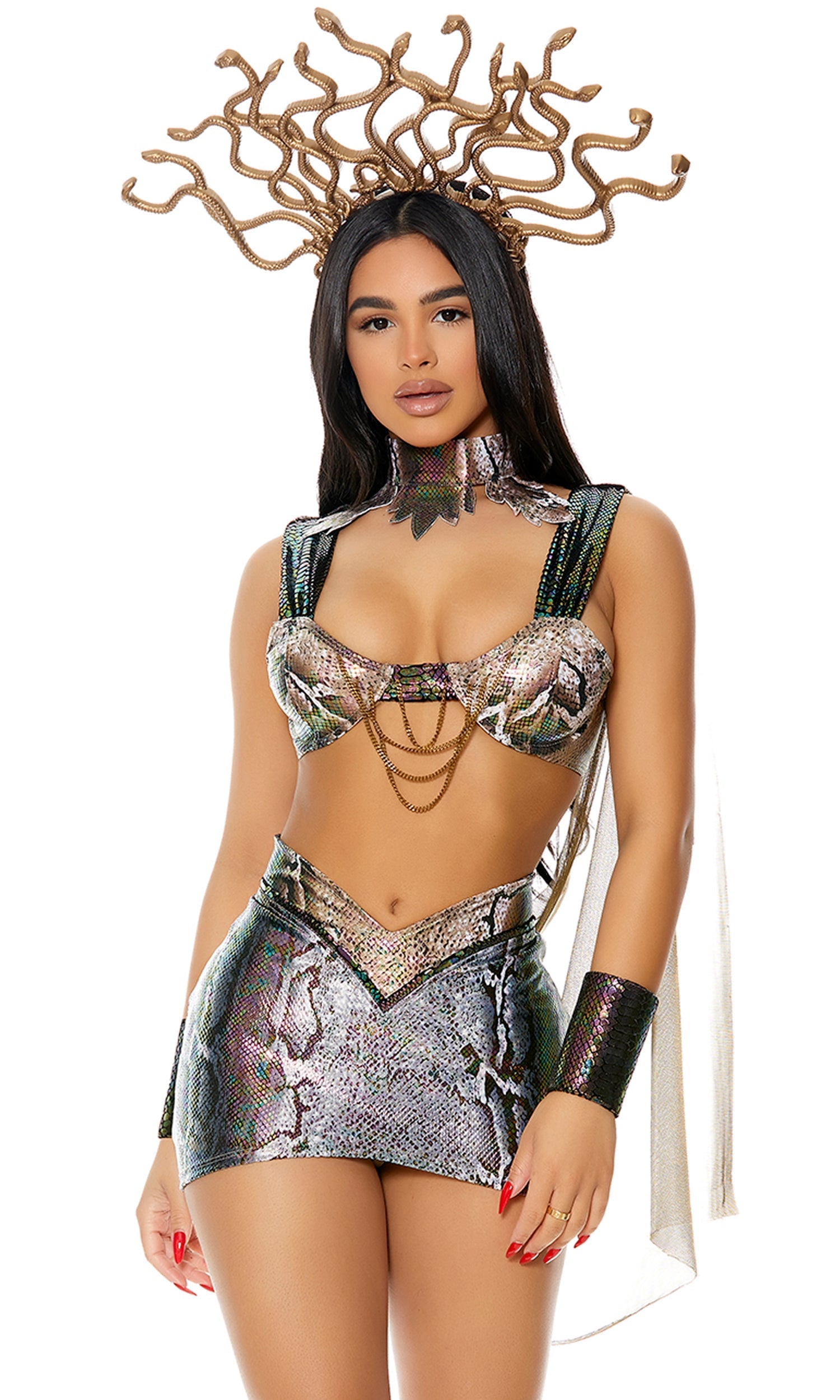 4pc. Sexy medusa costume features metallic reptile print foil underwire bra top with attached drapes and front chain detail paired with matching mini skirt and choker and wristlets.