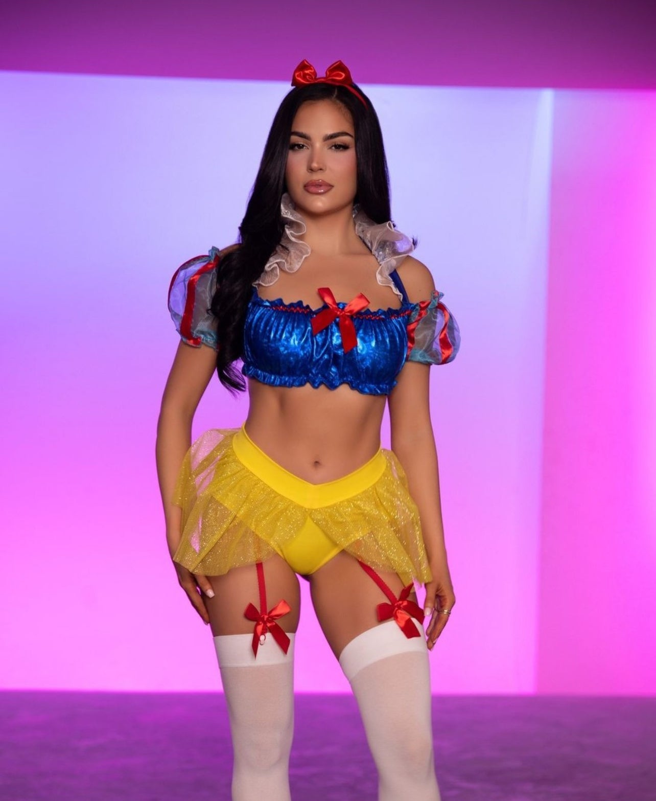 4 Pc Bad Apple Snow White, Includes Shimmer Halter Bandeau With Organza Puff Sleeves And Ruffle Collar, Garter Panty With Shimmer Sheer Skirt, And Matching Bow Headband and bow stockings
