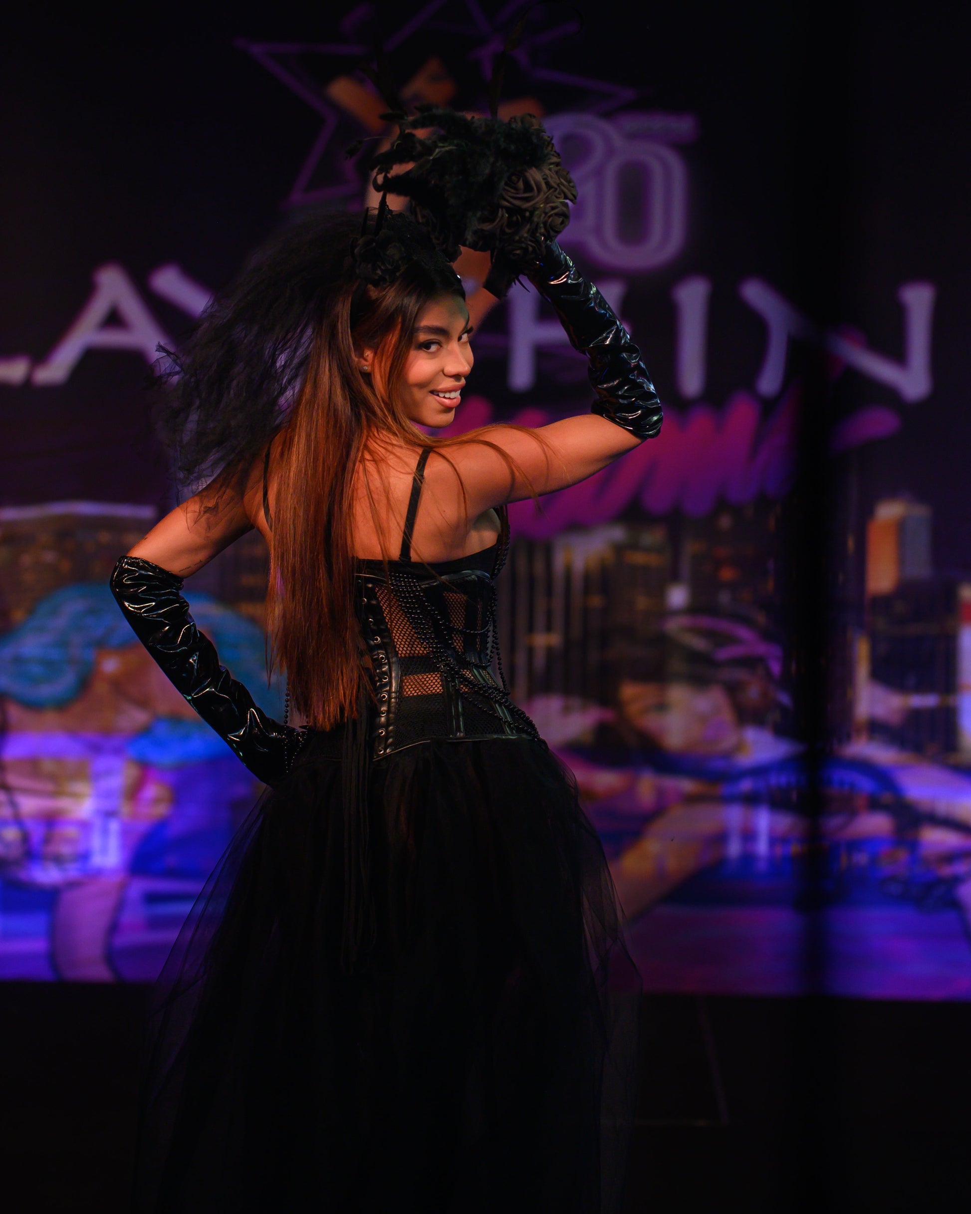 Adorn yourself with the opulent Black Rose Veil, Brazilian Thong, and Beaded Corset Bra (available in S,M,L) paired with an enticingly open front long Mesh Skirt. Complete your look with the glamorous duo of Gloves , leg garters, thigh high stockings and choker embellished with charms, and a Waist cincher (available in S,M,L). Also includes a stunning Bouquet, for when you dare to challenge death itself.