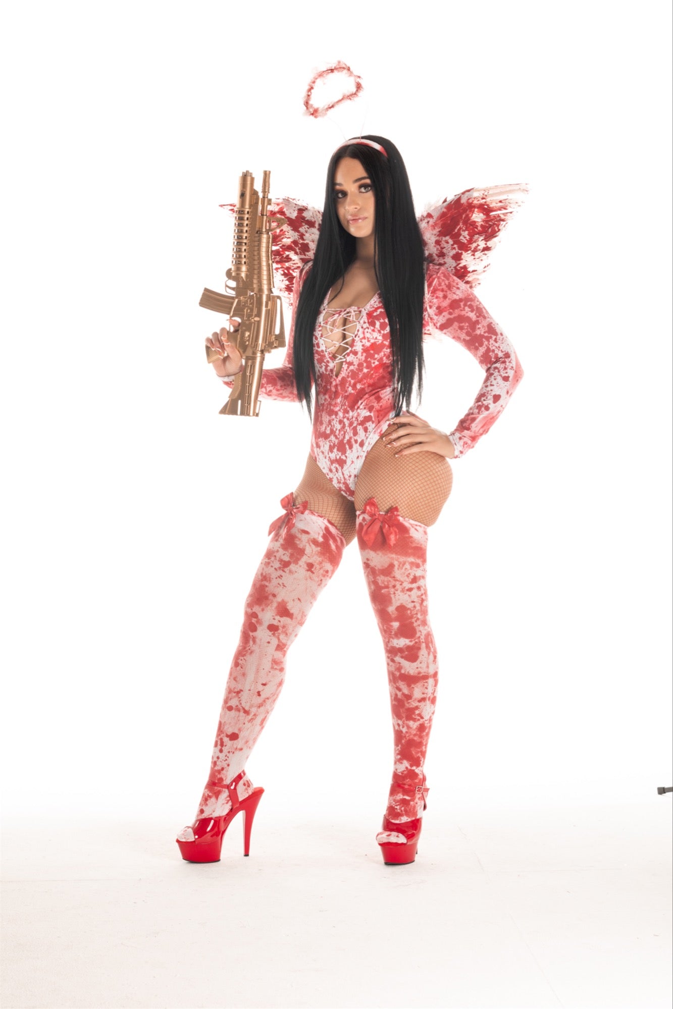 Dominate in style with our Blood Angel Costume that features a body suit, wings, halo, thigh highs, and a hand-painted blood splatter pattern! One size fits all -made by Playthings Miami! Dare to be bold and take flight in this edgy costume.