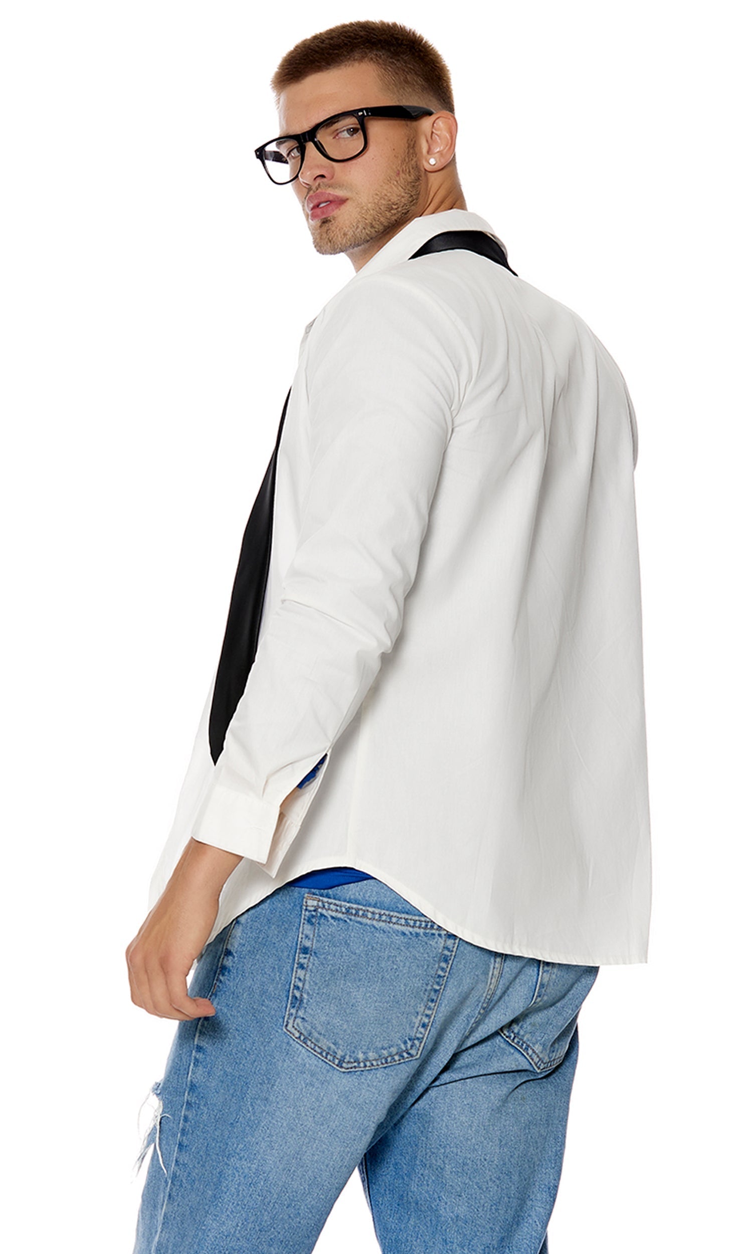 4-piece men's comic book character features long sleeve t-shirt with screen print decal paired with white poplin button down shirt and necktie and glasses.