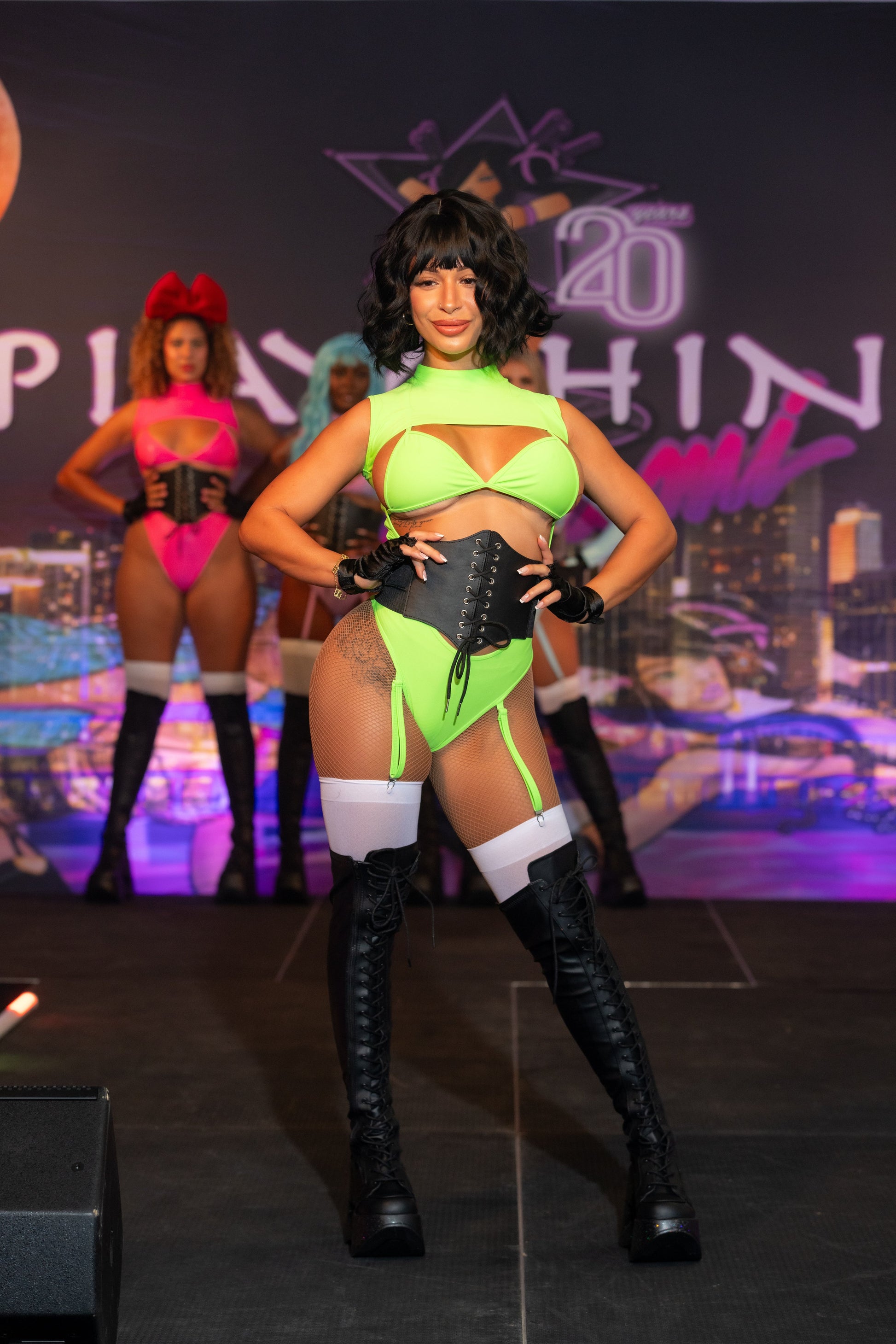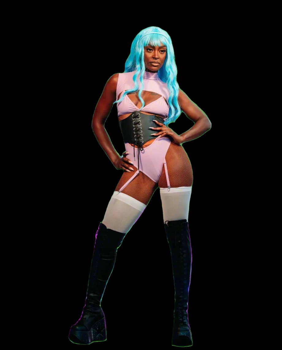 - sexy cartoon superhero character costume features bodysuit one size fits (S,M,L) with attached garters with bralette, waist cincher detail and white stockings.