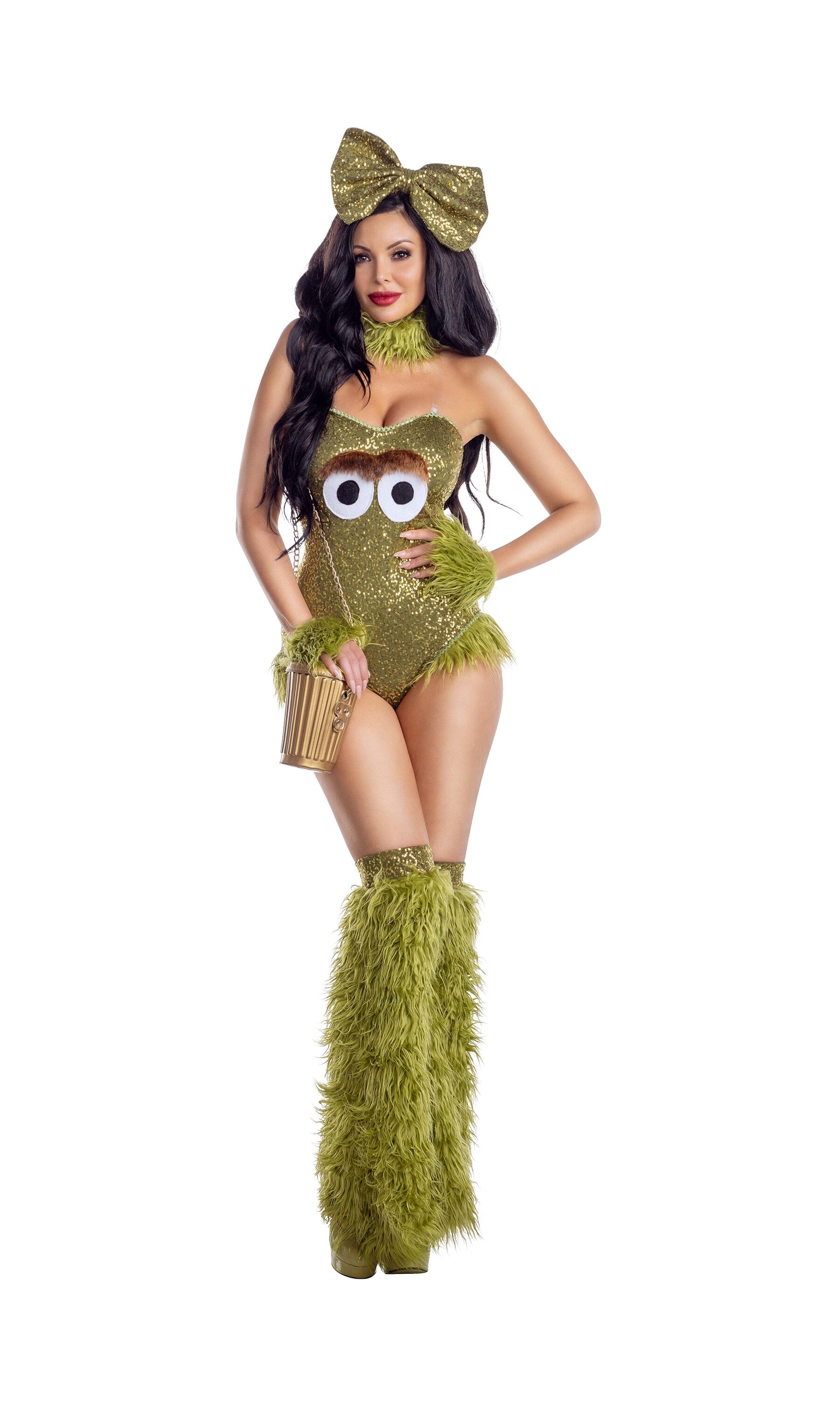 Cranky Creature green sequin teddy with green fur accents and eye details. Comes with matching furry leg warmers, headpiece, neckpiece, wristlets and trashcan purse.