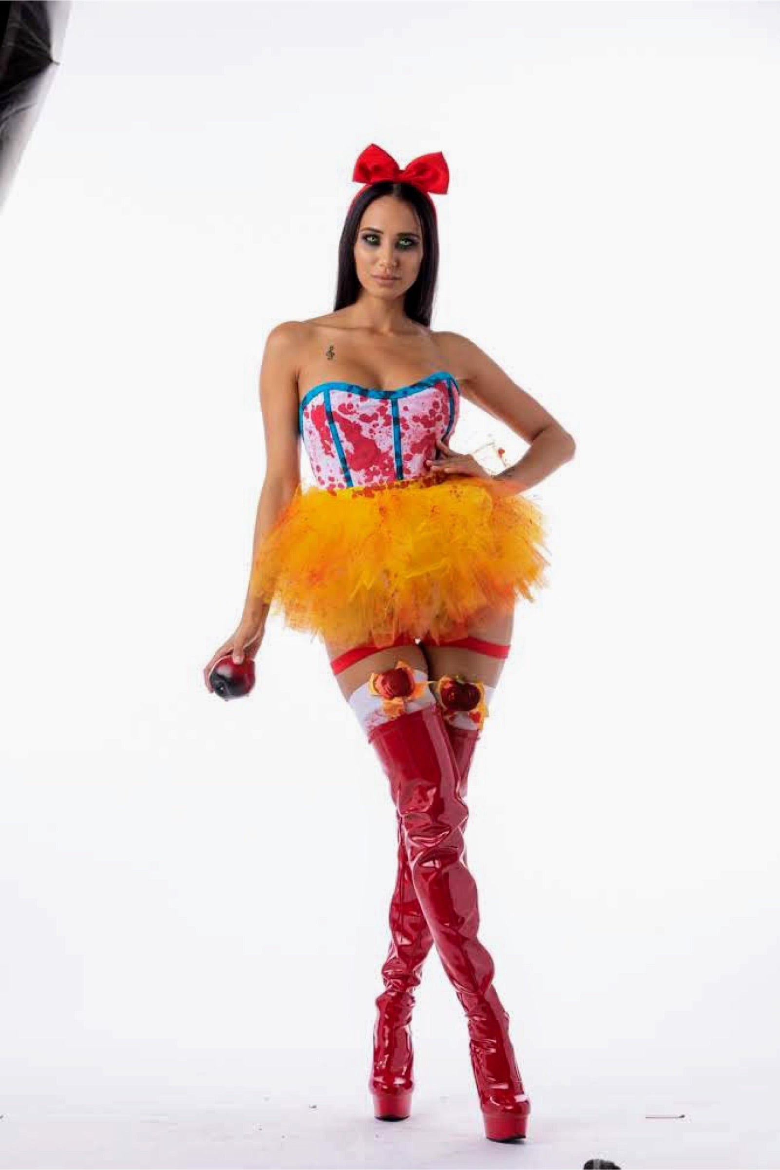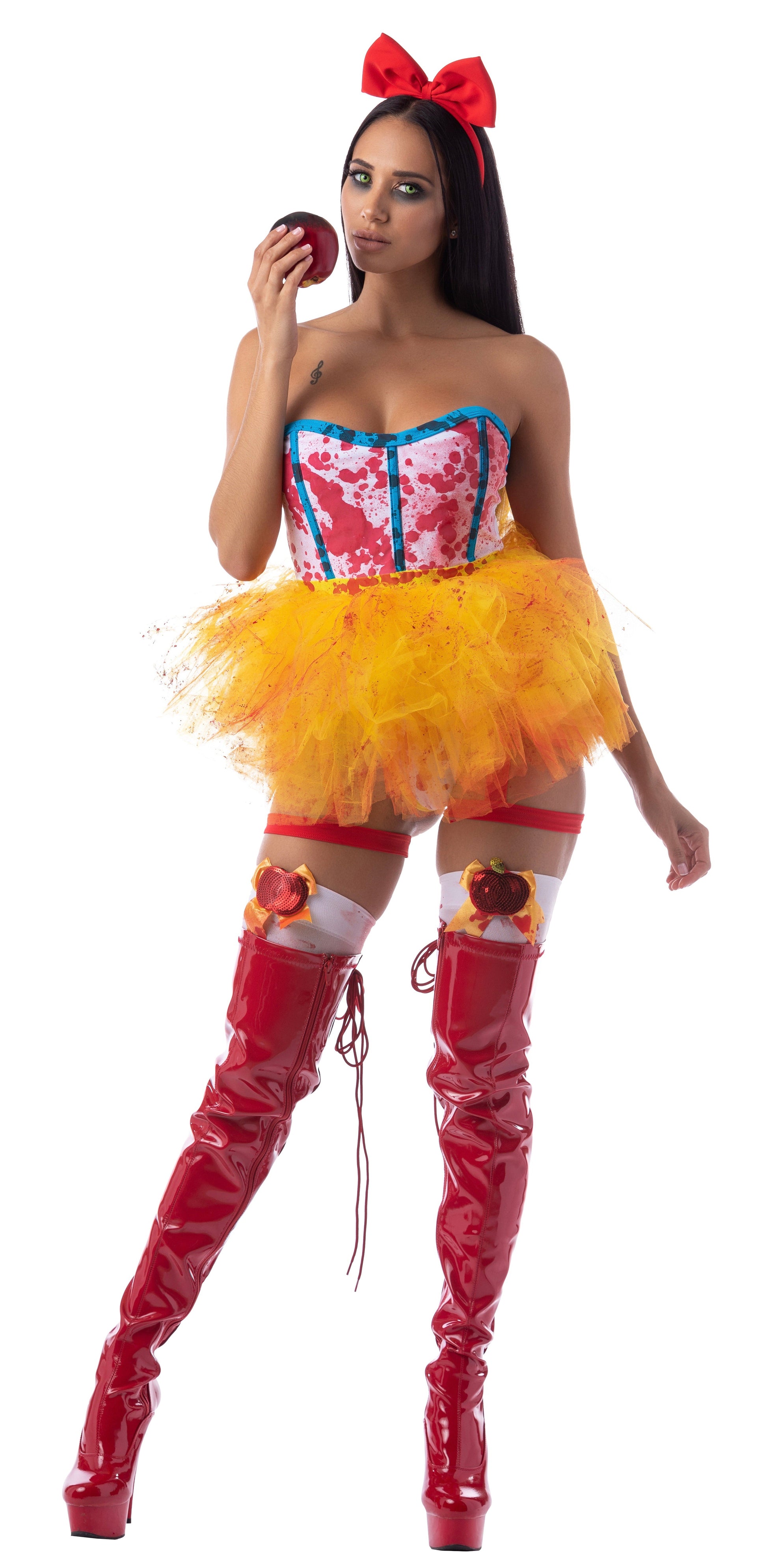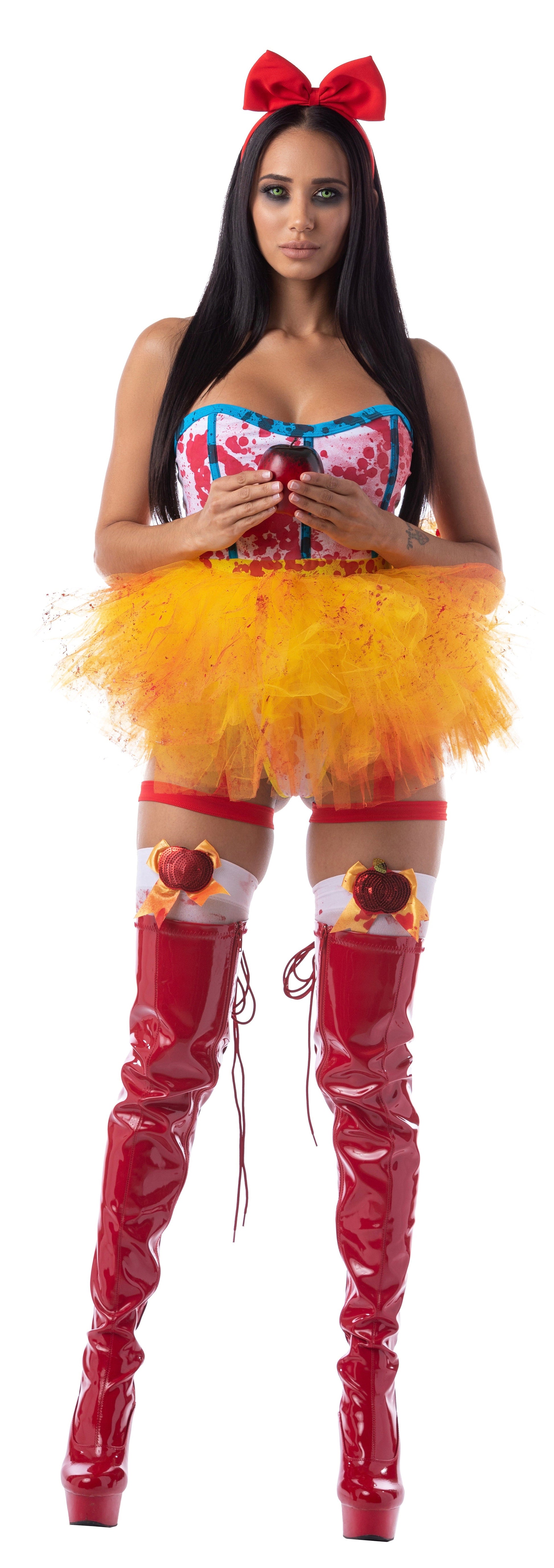 Bring out your inner Snow White with the bloody, mysterious, and oh-so-lovely Playthings Exclusive Troubled Snow Costume. Includes a bodysuit with attached red garters, bow headband, and thigh-high stockings with a bow, plus a bloody tutu—customized and hand-painted with blood splatter. Slay the competition in One Size Fits Most!