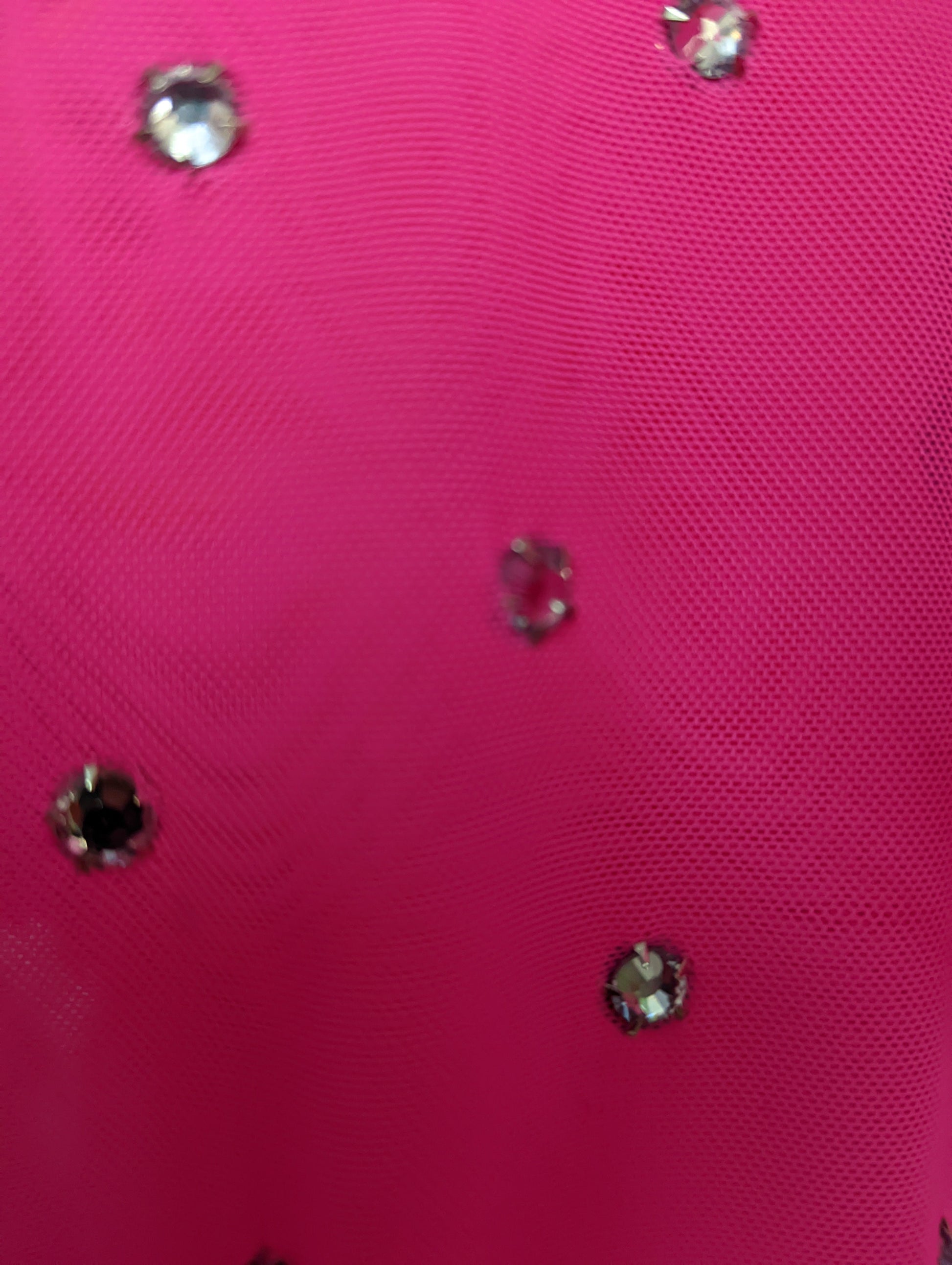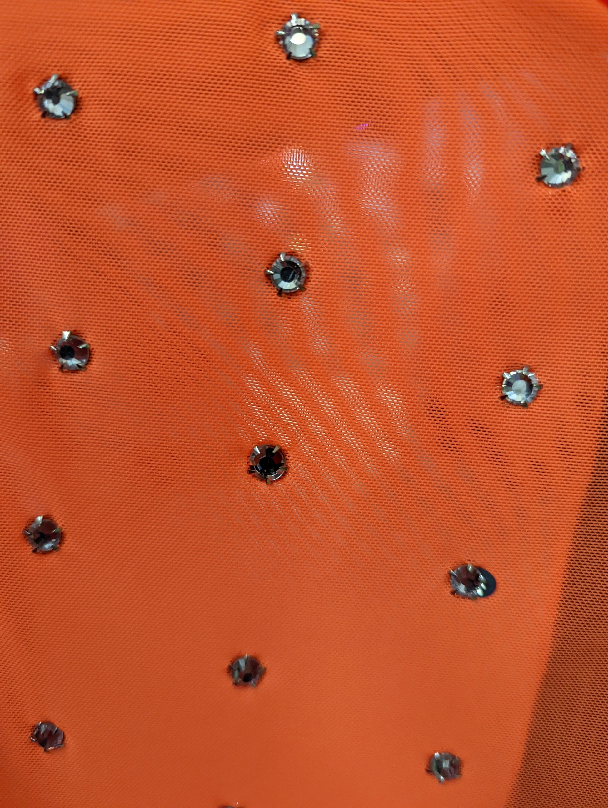 Hi-Neck Mesh Romper with sleeves with attached thong. Rhinestone detail and zipper back.
